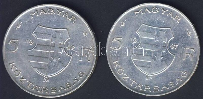 1947. 5Ft Ag "Kossuth" (2x) T:2- ph. https://www.darabanth.com/hu/128-Gyorsarveres/128.0/Numizmatika/Magyar-fem-es-ezustpenzek-a-kozepkortol-napjainkig-Hungarian-metal-and-silver-coins~300204/1947-5Ft-Ag-Kossuth-2x-T2-ph~II362351