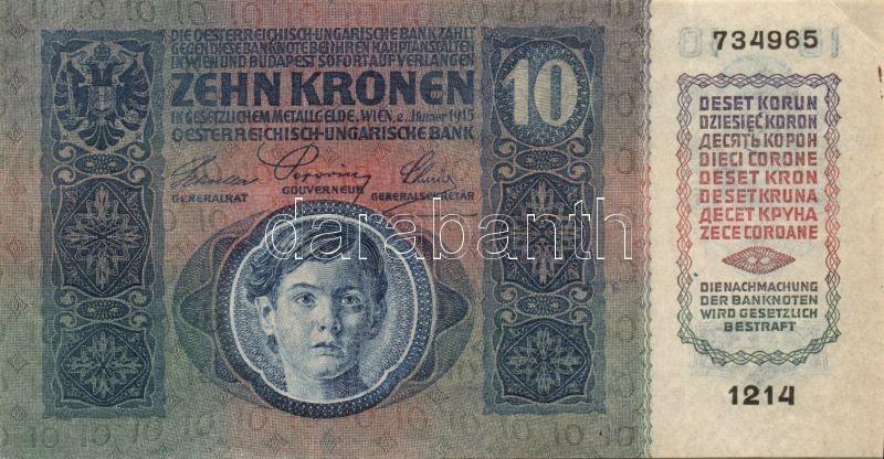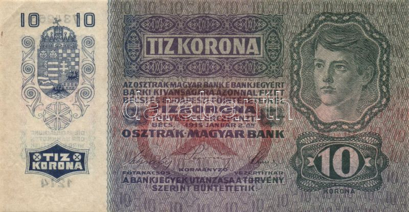 1915. 10K felülnyomás nélkül T:II- https://www.darabanth.com/hu/128-Gyorsarveres/128.0/Numizmatika/OsztrakMagyar-bankjegyek-Hungarian-Austro-Hungarian-banknotes~300207/1915-10K-felulnyomas-nelkul-TII-~II358757