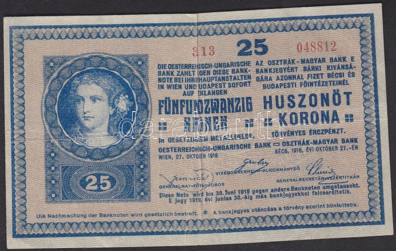 1918. 25K "3113" sorozatszám, hullámos T:III https://www.darabanth.com/hu/128-Gyorsarveres/128.0/Numizmatika/OsztrakMagyar-bankjegyek-Hungarian-Austro-Hungarian-banknotes~300207/1918-25K-3113-sorozatszam-hullamos-TIII~II360511