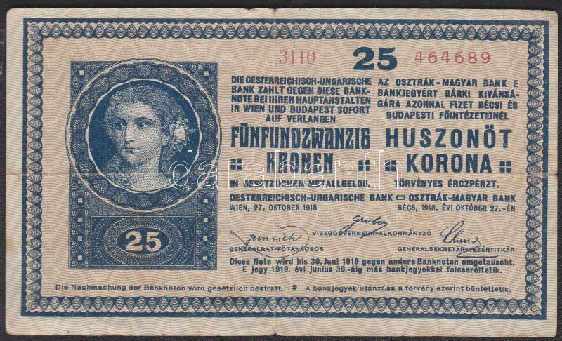 1918. 25K hullámos hátlap T:III https://www.darabanth.com/hu/128-Gyorsarveres/128.0/Numizmatika/OsztrakMagyar-bankjegyek-Hungarian-Austro-Hungarian-banknotes~300207/1918-25K-hullamos-hatlap-TIII~II360651