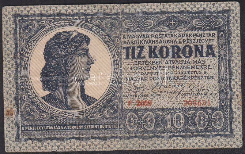 1919. augusztus 10K T:III https://www.darabanth.com/hu/128-Gyorsarveres/128.0/Numizmatika/OsztrakMagyar-bankjegyek-Hungarian-Austro-Hungarian-banknotes~300207/1919-augusztus-10K-TIII~II360492