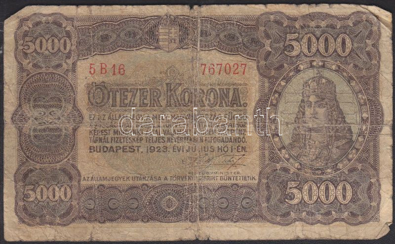 1923. 5000K nyomdahely nélkül T:III-/IV+ https://www.darabanth.com/hu/128-Gyorsarveres/128.0/Numizmatika/OsztrakMagyar-bankjegyek-Hungarian-Austro-Hungarian-banknotes~300207/1923-5000K-nyomdahely-nelkul-TIII-IVplus~II360655