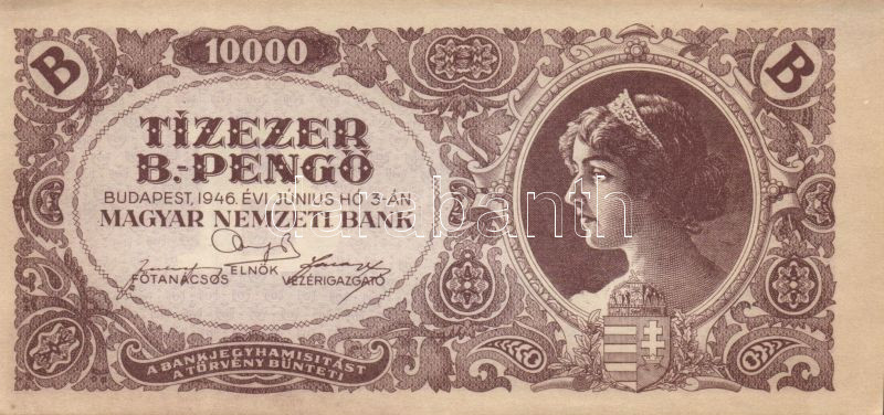 1946 10000BP balra tolódott nyomat T:I https://www.darabanth.com/hu/128-Gyorsarveres/128.0/Numizmatika/OsztrakMagyar-bankjegyek-Hungarian-Austro-Hungarian-banknotes~300207/1946-10000BP-balra-tolodott-nyomat-TI~II362864