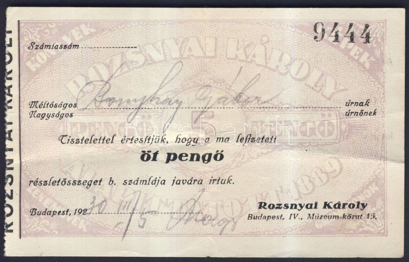 Leírás: 1930. Rozsnyai Károly 5P számla jóváírási számla T:2