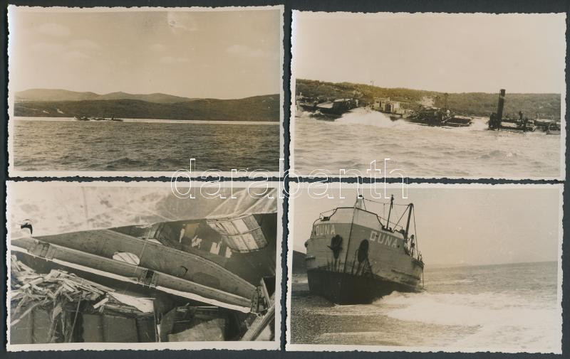 1940 A zátonyra futott "Duna" tengeri áruszállító gőzhajó roncsairól készült 4 db fotó. A hajó a Fekete Tengeren futott zátonyra Podima közlében. / 4 photos of the sea-steamer "Duna" snagged on the Black Sea near Podima. 14x8 cm