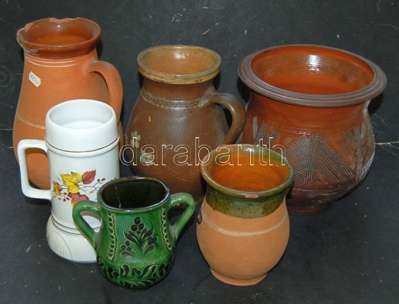 Vegyes porcelán és kerámia tétel: Hollóházi kézzel festett sörös kupa, öblös népi jelzett kerámia korsó, teje kancsó, kézzel festett anyag kancsó, kétfülű kis kancsó