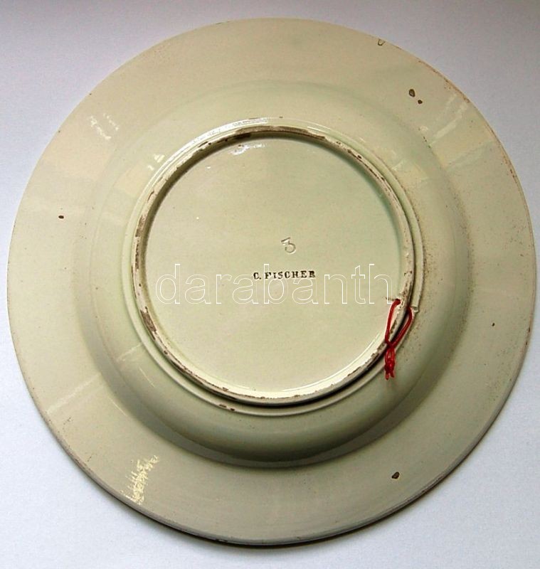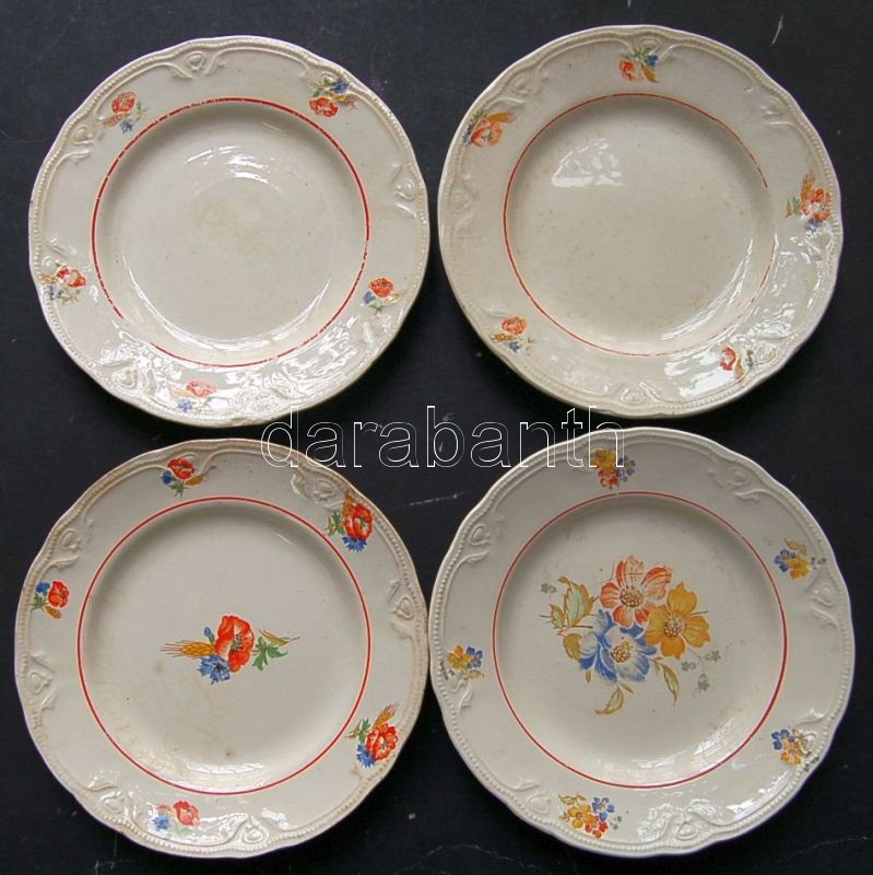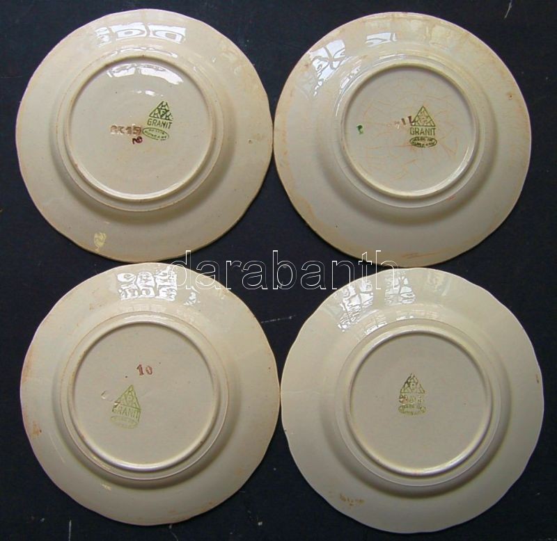 4db háború elötti fajansz tányérkák Gránit jelzéssel ellátva, különféle méretben és állapotban + ~1910 C. Fischer nyomással ellátott porcelán fajansz falitányér 23cm-es átmérővel