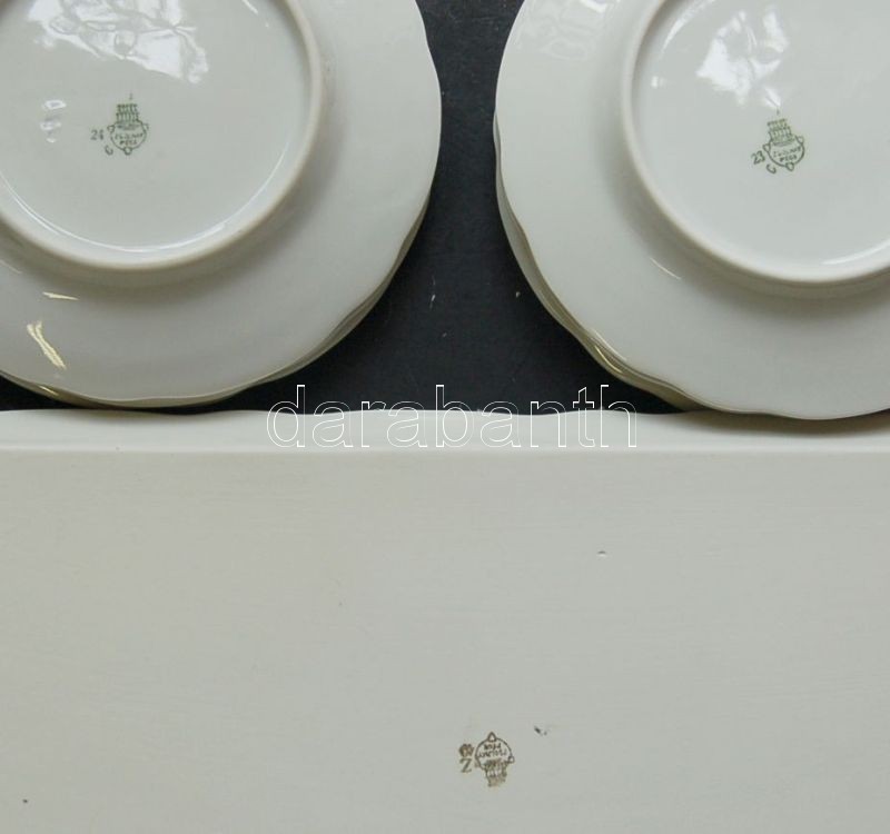 cca. 1930 Hatrészes, aranyozott szegélymintájú Zsolnay süteményes tány... https://www.darabanth.com/hu/133-Gyorsarveres/133.0/Festmeny-mutargy-papirregiseg-egyeb/Porcelan~275/cca-1930-Hatreszes-aranyozott-szegelymintaju-Zsolnay-sutemenyes-tanyerkeszlet-a-hozza-ta~II375847