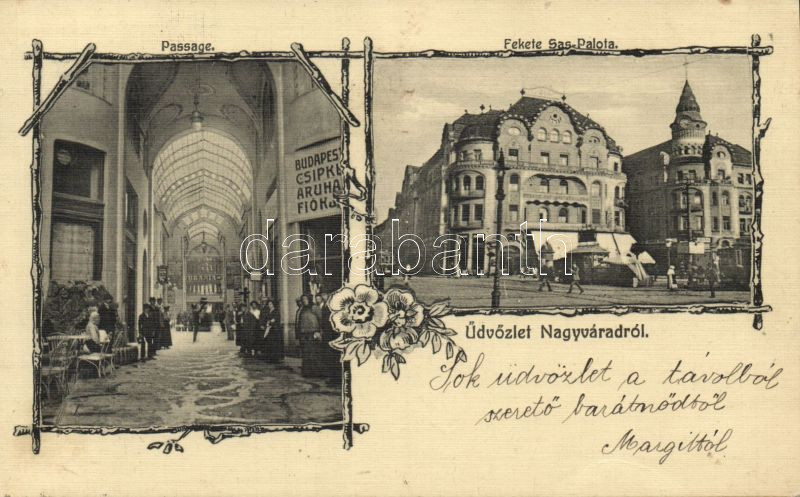 Nagyvárad Hotel and Passage Fekete Sas https://www.darabanth.com/hu/133-Gyorsarveres/133.0/Kepeslapok/Erdely~400007/Nagyvarad-Hotel-and-Passage-Fekete-Sas~II381392