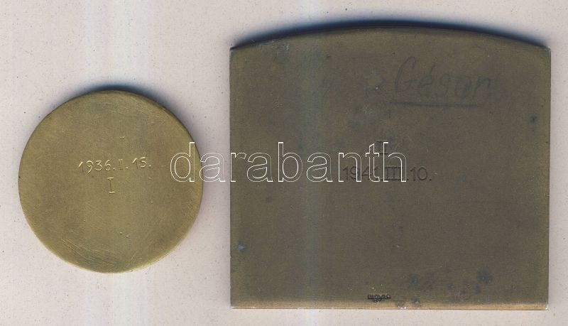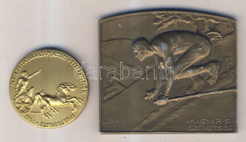 Leírás: 1941. "Magyar Sí Szövetség" szögletes Br plakett. Szign.Berán Lajos T:3 + 1936. M.Kir. Postatakarékpénztári Tisztviselők Sportegylete 1903. díjérem szign.Szalmássy T:2