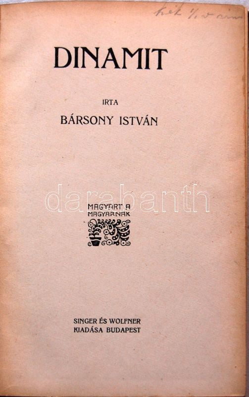 Bársony István: Dinamit: természetírás Singer és Wolfner, kiadói egész... https://www.darabanth.com/hu/134-Gyorsarveres/134.0/Festmeny-mutargy-papirregiseg-egyeb/Konyvek-konyha-es-kert~198/Barsony-Istvan-Dinamit-termeszetiras-Singer-es-Wolfner-kiadoi-egeszvaszon-kotesben~II385165