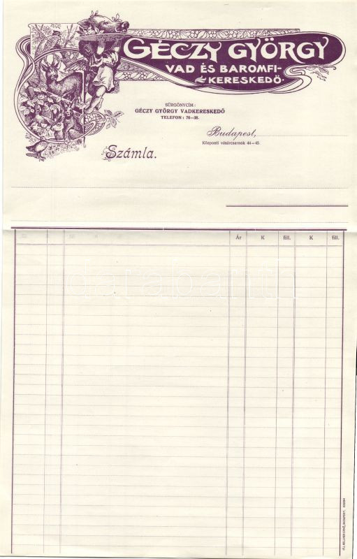 cca 1900 Géczy György vad-kereskedő fejléces számla https://www.darabanth.com/hu/134-Gyorsarveres/134.0/Festmeny-mutargy-papirregiseg-egyeb/Reklam~189/cca-1900-Geczy-Gyorgy-vad-kereskedo-fejleces-szamla~II383862