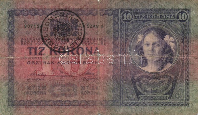 1904. 10K román körbélyegzővel T:IV https://www.darabanth.com/hu/135-Gyorsarveres/135.0/Numizmatika/Osztrak-magyar-Magyar-es-Magyar-vonatkozasu-Bankjegyek~400024/1904-10K-roman-korbelyegzovel-TIV~II358780