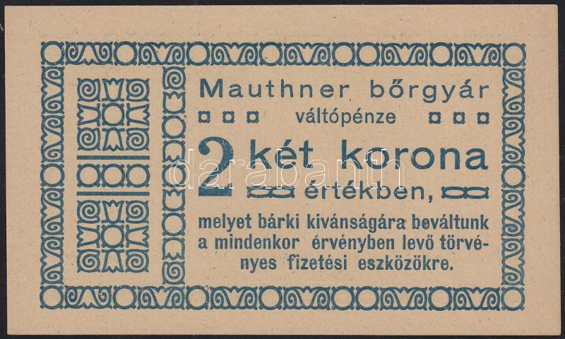 Mauthner Bőrgyár 2K váltópénz T:I https://www.darabanth.com/hu/135-Gyorsarveres/135.0/Numizmatika/Papir-es-fem-szuksegpenzek~400022/Mauthner-Borgyar-2K-valtopenz-TI~II388950