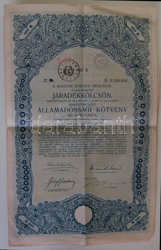 1912. A Magyar Korona Országai Járadékkölcsön államadóssági kötvénye 1... https://www.darabanth.com/hu/135-Gyorsarveres/135.0/Numizmatika/Reszvenyek-Ertekpapirok-Sorsjegyek~400021/1912-A-Magyar-Korona-Orszagai-Jaradekkolcson-allamadossagi-kotvenye-100K-rol~II390004