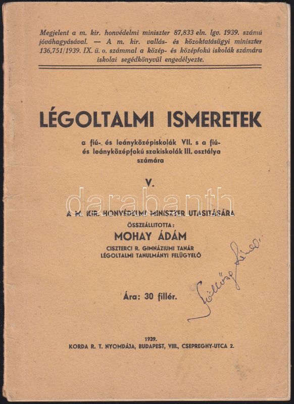 Mohay Ádám: Légoltalmi ismeretek, Korda R. nyomdája 1939 https://www.darabanth.com/hu/136-Gyorsarveres/136.0/Festmeny-mutargy-papirregiseg-egyeb/Militaria~222/Mohay-Adam-Legoltalmi-ismeretek-Korda-R-nyomdaja-1939~II393589