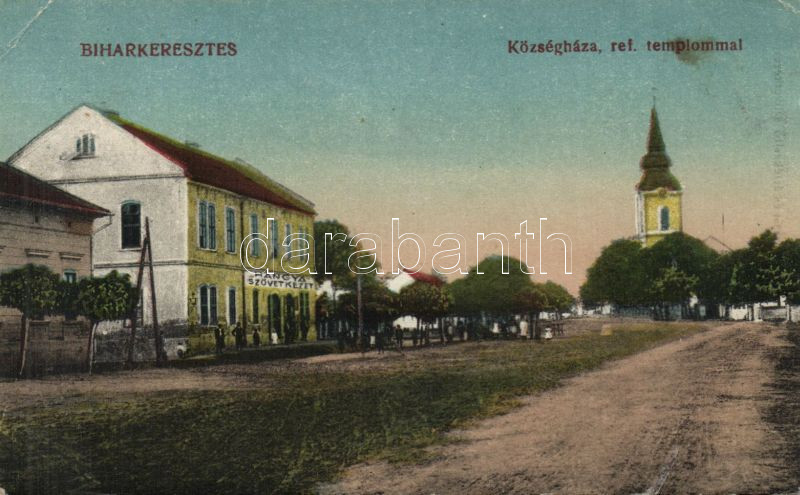 Leírás: Biharkeresztes Községháza és Református templom Hangyával (EK)