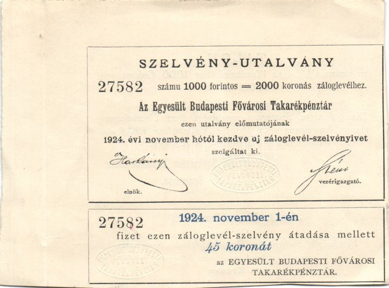 Leírás: 1924. Egyesült Budapesti Fővárosi Takarékpénztár szelvény-utalványa 1000Ft=2000K-ás záloglevele, szárazpecséttel T:I-