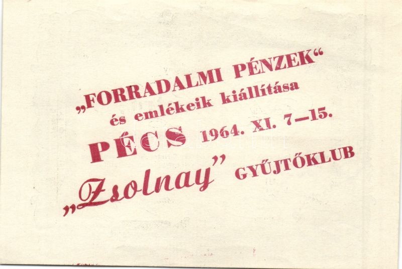 Leírás: 1849. 10Ft "Kincstári utalvány" 1964-es utánnyomata "Forradalmi Pénzek és emlékeik kiállítása Pécs 1964. XI. 7-15. Zsolnay Gyűjtőklub" T:I