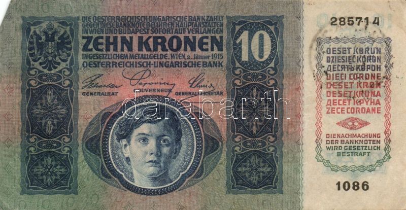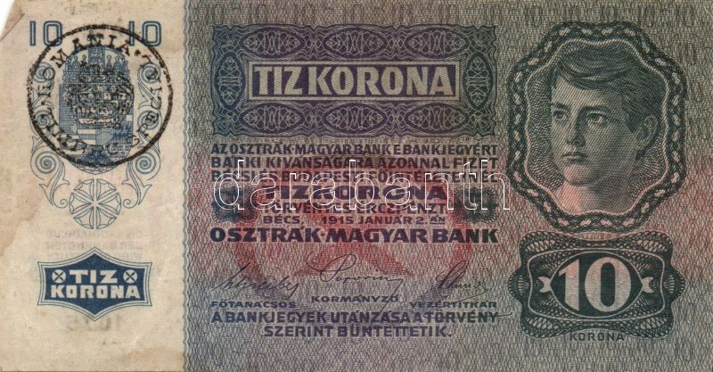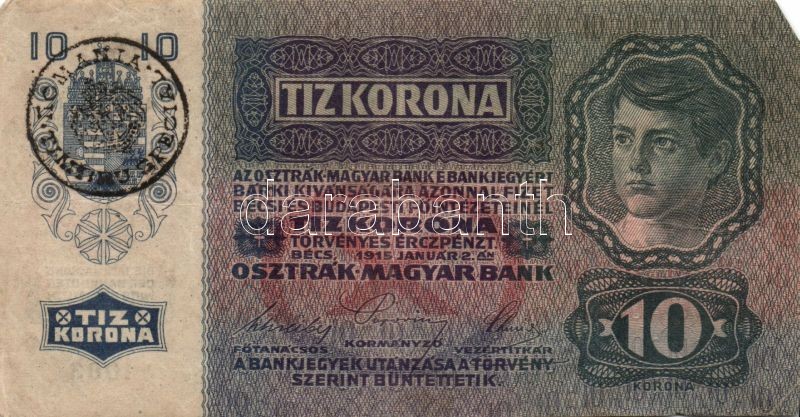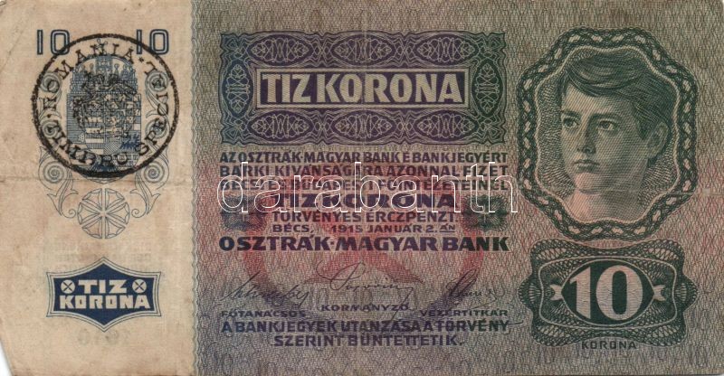 1915. 10K (10x) román körbélyegzővel T:III,III- https://www.darabanth.com/hu/136-Gyorsarveres/136.0/Numizmatika/Magyar-es-magyar-vonatkozasu-bankjegyek~300089/1915-10K-10x-roman-korbelyegzovel-TIII-III-~II390774