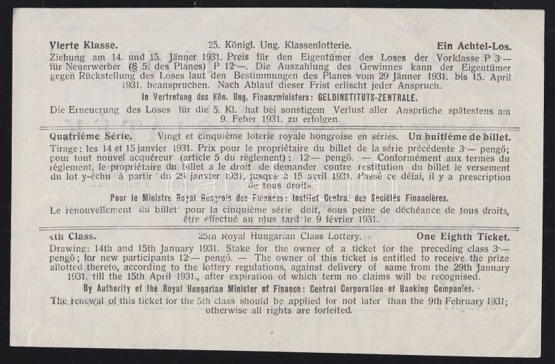 1931. "25. Magyar Királyi Osztálysorsjáték" negyedik osztály egy nyolc... https://www.darabanth.com/hu/136-Gyorsarveres/136.0/Numizmatika/Reszvenyek-Ertekpapirok-Sorsjegyek~300087/1931-25-Magyar-Kiralyi-Osztalysorsjatek-negyedik-osztaly-egy-nyolcad-sorsjegye-TI-~II393460