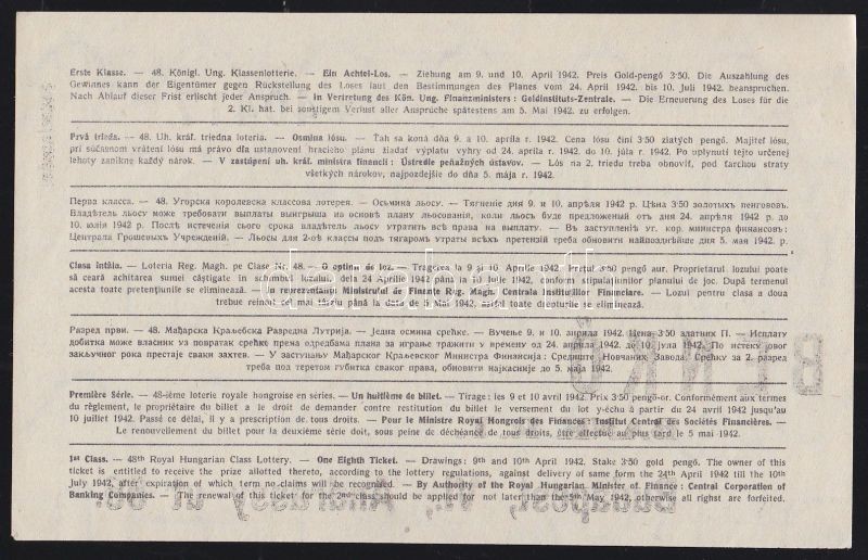 Leírás: 1942. "48. Magyar Királyi Osztálysorsjáték" első osztály egy nyolcad sorsjegye T:I