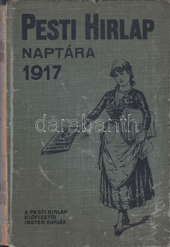 1917 Pesti Hírlap naptára az 1917. közönséges évre, Légrády Testvérek,... https://www.darabanth.com/hu/137-Gyorsarveres/137.0/Festmeny-mutargy-papirregiseg-egyeb/Konyvek-egyeb-ritkasagok~296/1917-Pesti-Hirlap-naptara-az-1917-kozonseges-evre-Legrady-Testverek-Budapest-6K~II398497
