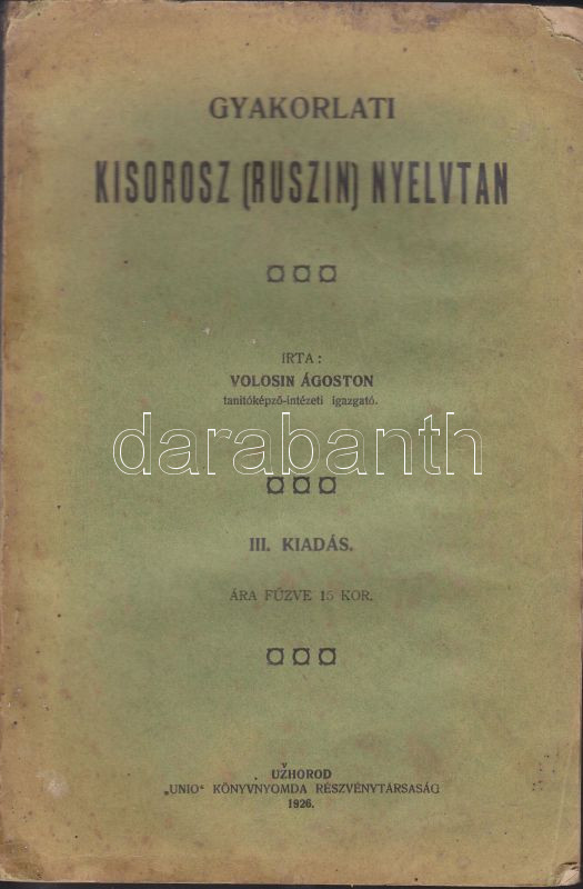 1926 Volosin Ágoston: Gyakorlati kisorosz (ruszin) nyelvtan, Unio Köny... https://www.darabanth.com/hu/137-Gyorsarveres/137.0/Festmeny-mutargy-papirregiseg-egyeb/Konyvek-egyeb-ritkasagok~296/1926-Volosin-Agoston-Gyakorlati-kisorosz-ruszin-nyelvtan-Unio-Konyvnyomda-Ungvar~II398175