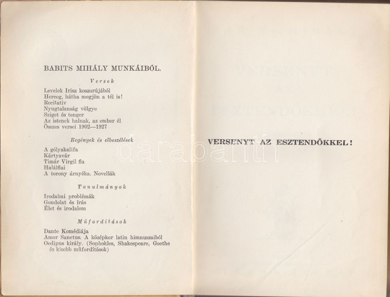 Babits Mihály: Versenyt az esztendőkkel új költemények (1928-1933), Ny... https://www.darabanth.com/hu/137-Gyorsarveres/137.0/Festmeny-mutargy-papirregiseg-egyeb/Konyvek-egyeb-ritkasagok~296/Babits-Mihaly-Versenyt-az-esztendokkel-uj-koltemenyek-1928-1933-Nyugat-Elso-kiadas-Szab~II398669