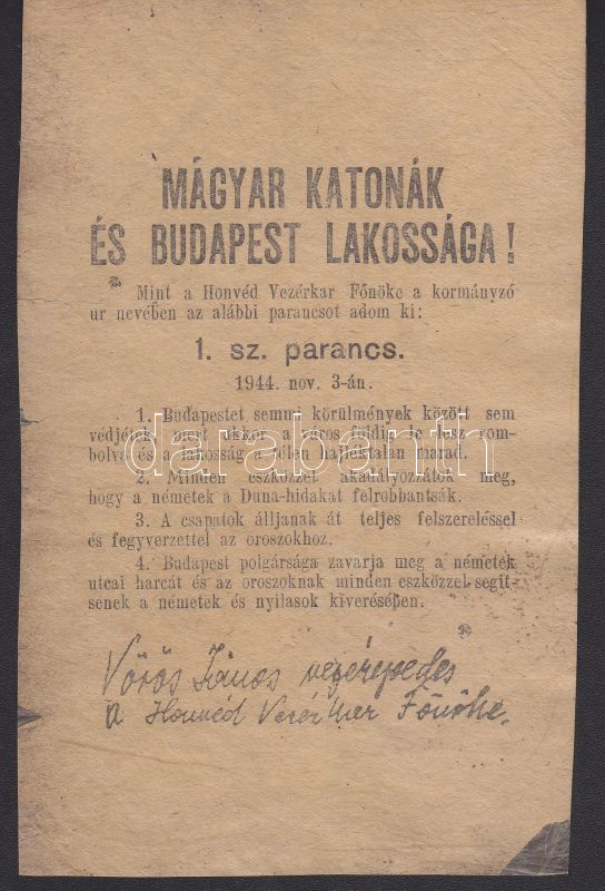 1944 Vörös János vezérezredes, a Honvéd Vezérkar főnökének parancsa, m... https://www.darabanth.com/hu/137-Gyorsarveres/137.0/Festmeny-mutargy-papirregiseg-egyeb/Militaria~291/1944-Voros-Janos-vezerezredes-a-Honved-Vezerkar-fonokenek-parancsa-melyben-a-Voros-Hads~II394835
