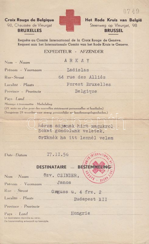 Leírás: 1956 Nyugati rokon érdeklődése a Vöröskereszten keresztül a magyar forradalom által érintett magyar családtagról