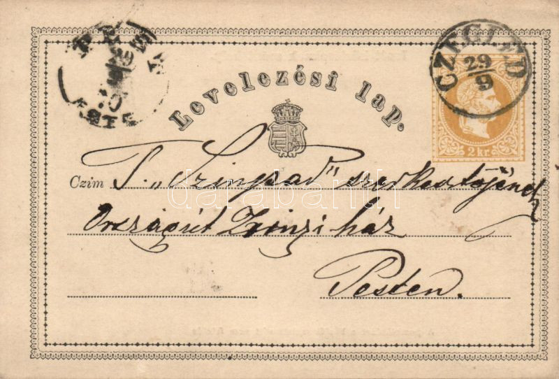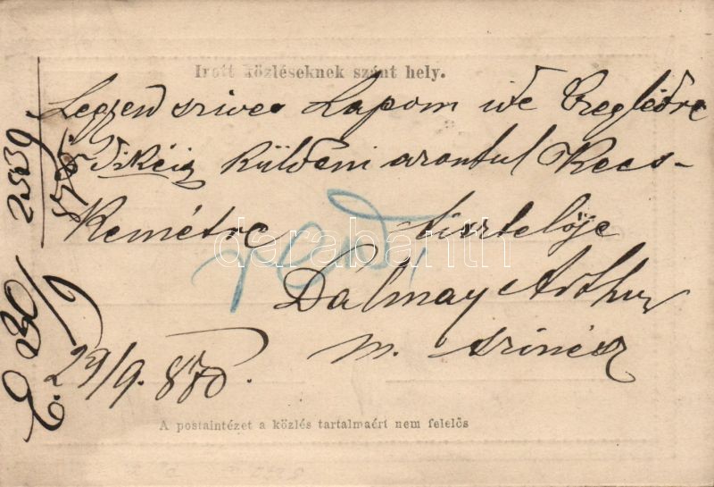 Leírás: 1870 Dalmay Arthur (Kubinszky Antal) színigazató és színész sajátkezű levelezőlapja