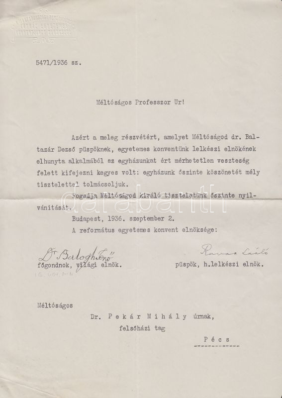 Leírás: 1936. Dr. Balogh Jenő igazságügyi miniszter és Ravasz László püspök aláírt levele