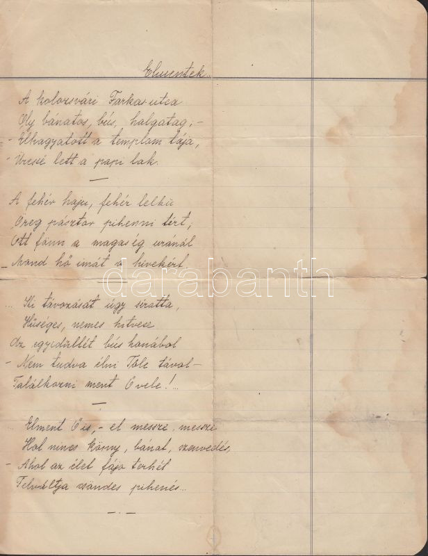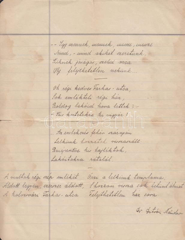 ~1900. Ditrói Nándor a Kolozsvári Egyetemi Kör elnökének Elmentek című... https://www.darabanth.com/hu/138-Gyorsarveres/138.0/Festmeny-mutargy-papirregiseg-egyeb/Alairas~400020/7E1900-Ditroi-Nandor-a-Kolozsvari-Egyetemi-Kor-elnokenek-Elmentek-cimu-versenek-eredeti-ke~II401515