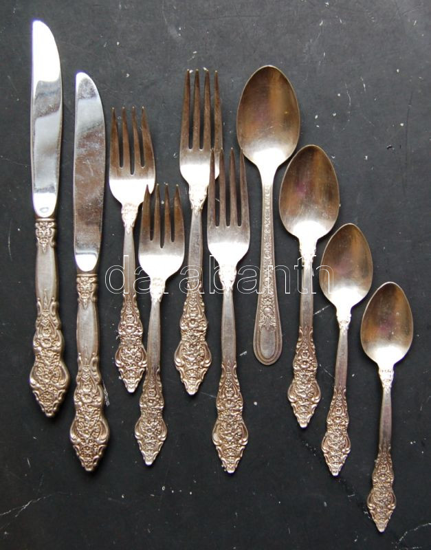 Leírás: 2 személyes ezüstözött réz evőeszközkészlet: kés, villa, kanál, kis villa, kis kanál