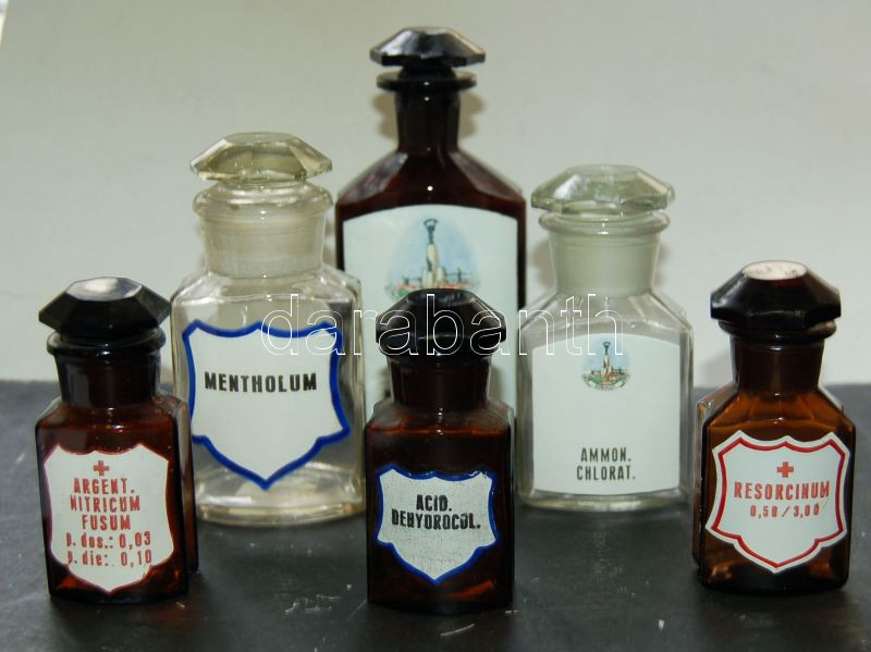 Leírás: 6 db régi klf méretű gyógyszeres üveg felcímkézve