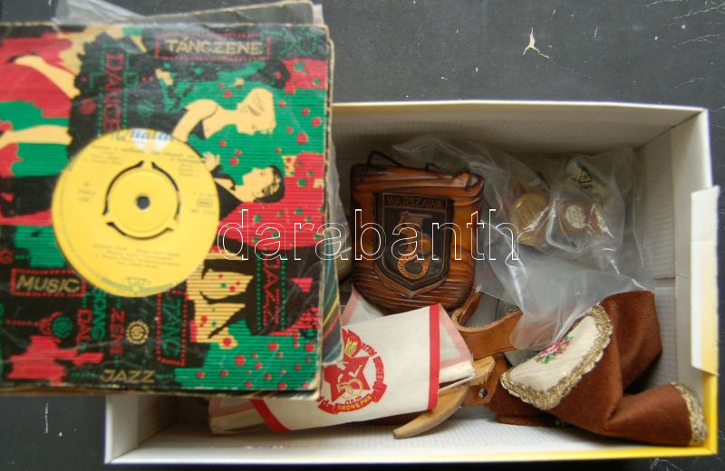 Leírás: Bolha tétel: bakelit lemezek, fém kancsó, asztali díszek, zászló, kitűzők, terítő, levélnyitó, öngyújtó, szaru kürt