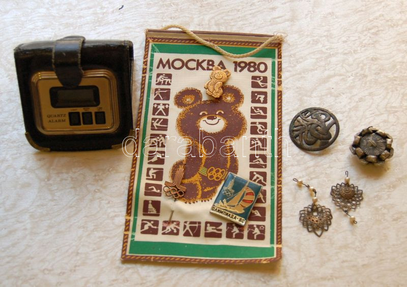 Leírás: Kis bolha tétel: bizsuk, hajfonat korong, utazó-ébresztőóra és olimpiai molinó jelvénnyel