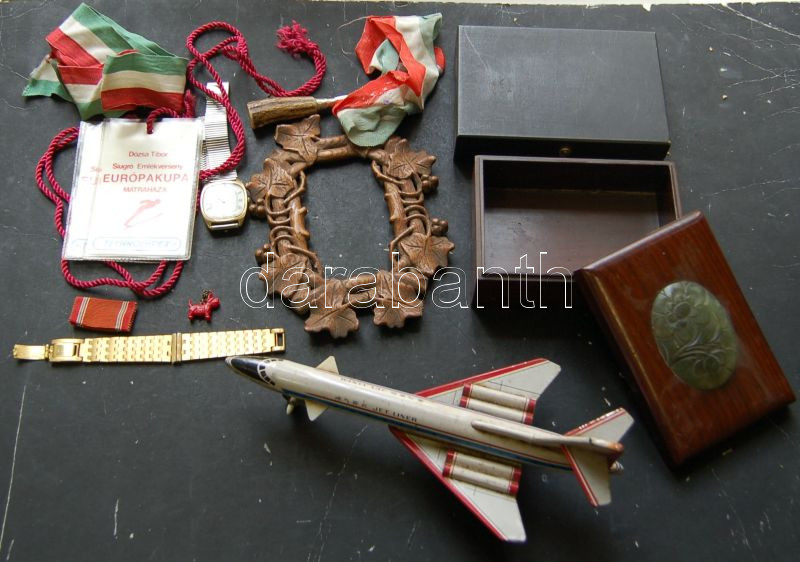 Leírás: Kis bolha tétel: repülőmakett, képkeret, ékszeres dobozka, magyar nemzeti színű szalagok, órák. stb-