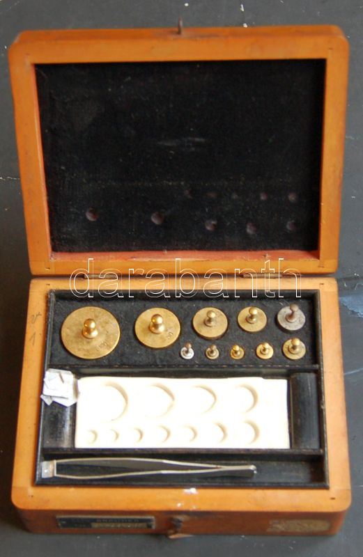 Leírás: Régi egyetemi laborsúlykészlet klf tömegű réz és alumínium darabokkal, csipesszel, eredeti fadobozban