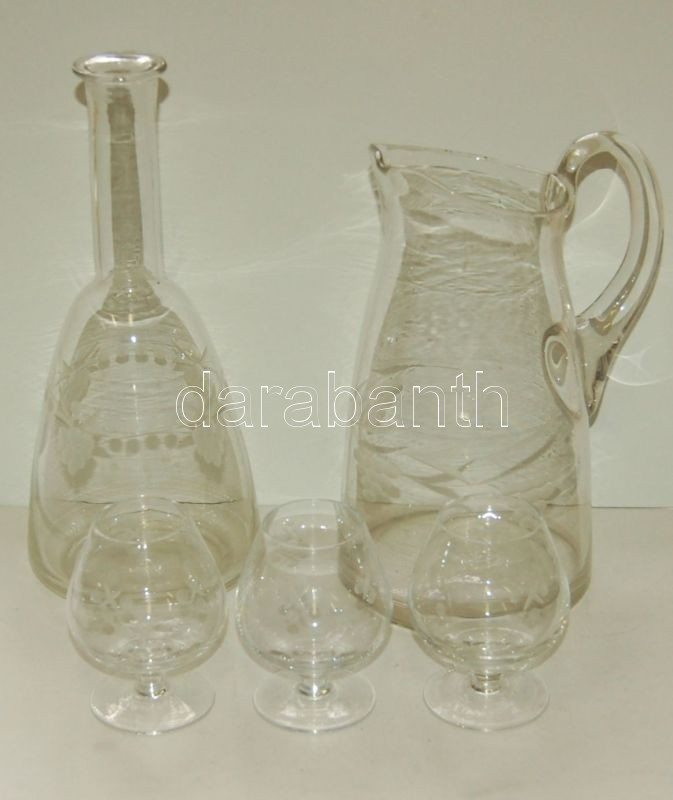 Leírás: cca 1900 Metszett üveg italos-készlet likörösüveg, kacsó, 2 liköröspohár / Antique glass set