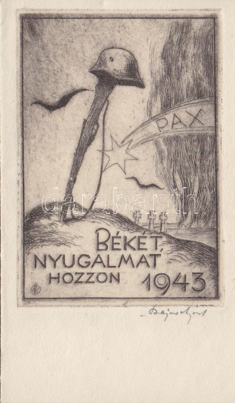 Bajor Ágost (1892-1958) "Békét, nyugalmat hozzon 1943" szignált rézkar... https://www.darabanth.com/hu/138-Gyorsarveres/138.0/Festmeny-mutargy-papirregiseg-egyeb/Festmenyek-es-grafikak~400015/Bajor-Agost-1892-1958-Beket-nyugalmat-hozzon-1943-szignalt-rezkarc~II401065