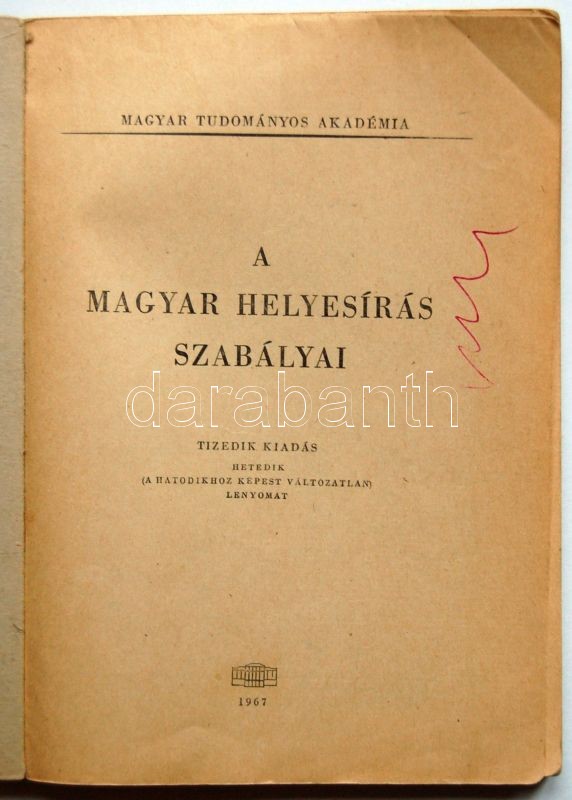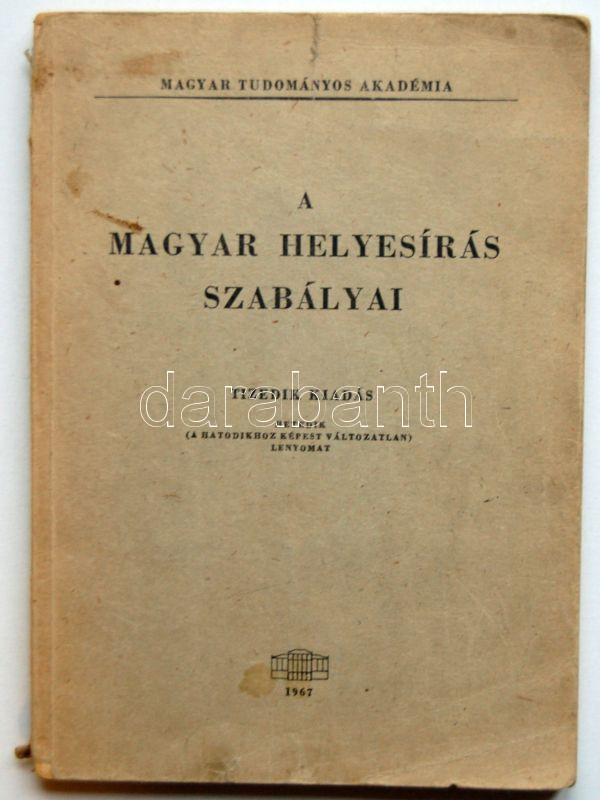 1967 A magyar helyesírás szabályai 10. kiadás https://www.darabanth.com/hu/138-Gyorsarveres/138.0/Festmeny-mutargy-papirregiseg-egyeb/Konyvek-egyeb-ritkasagok~400037/1967-A-magyar-helyesiras-szabalyai-10-kiadas~II401430