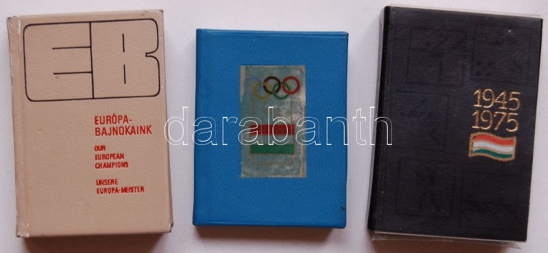 Leírás: 3db klf sporttal kapcsolatos minikönyv, mint: Európa-bajnokaink, 1945-1975. Három évtized sportja, 1896-1972 Magyarok az Olimpiákon