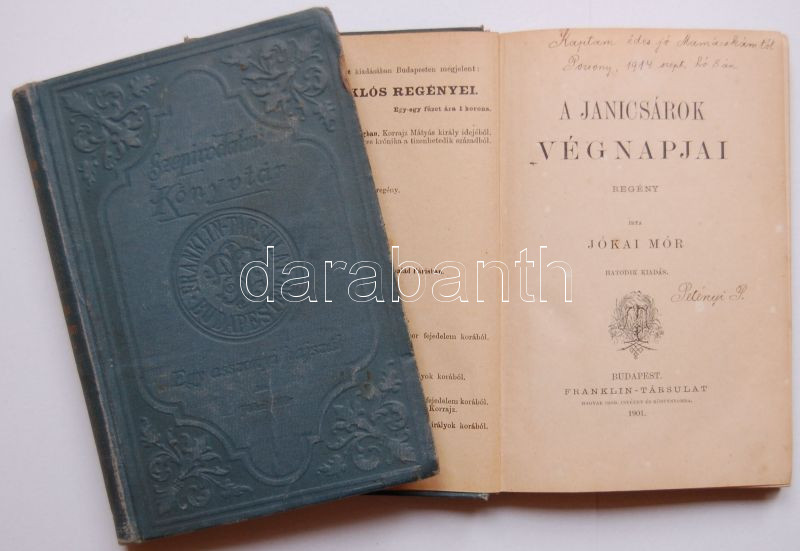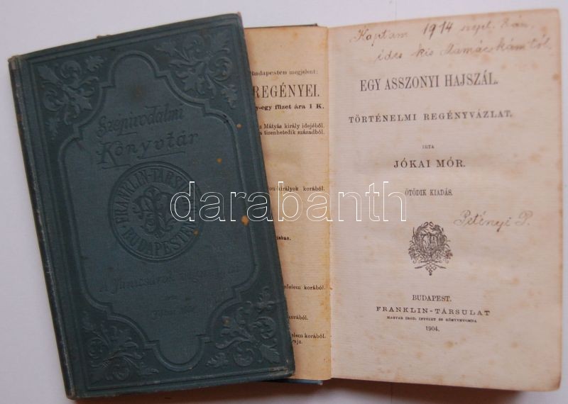 Szépirodalmi könyvtár: Jókai: janicsárok végnapjai, Egy asszonyi hajsz... https://www.darabanth.com/hu/138-Gyorsarveres/138.0/Festmeny-mutargy-papirregiseg-egyeb/Konyvek-egyeb-ritkasagok~400037/Szepirodalmi-konyvtar-Jokai-janicsarok-vegnapjai-Egy-asszonyi-hajszal-Franklin-1901-domb~II400186