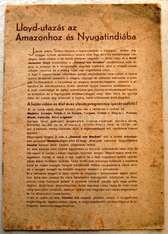 1938 Lloyd-utazás az Amazonhoz és Nyugatindiába reklám fotókkal, hajó... https://www.darabanth.com/hu/138-Gyorsarveres/138.0/Festmeny-mutargy-papirregiseg-egyeb/Konyvek-utazas-varosok~400035/1938-Lloyd-utazas-az-Amazonhoz-es-Nyugatindiaba-reklam-fotokkal-hajojegy-arakkal~II385445