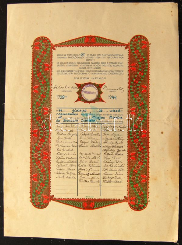 1939 Vásárosnamény: Irredenta érettségi emléklap 31x42 cm https://www.darabanth.com/hu/138-Gyorsarveres/138.0/Festmeny-mutargy-papirregiseg-egyeb/Nyomtatvanyok~400030/1939-Vasarosnameny-Irredenta-erettsegi-emleklap-31x42-cm~II401135