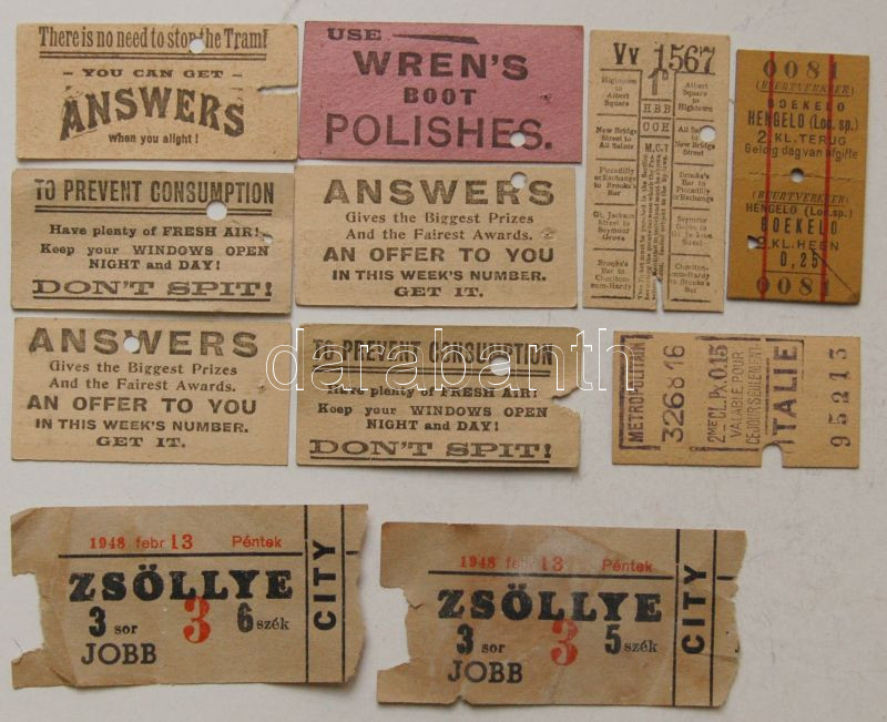 Leírás: 9 db külföldi vasút és villamosjegy + 2 magyar mozijegy 1948-ból / Tram and train tickets