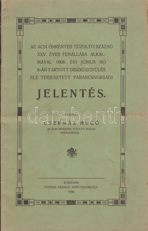 Komárom 1908. Az ácsi önkéntes tűzoltó század XXV. éves parancsnoksági... https://www.darabanth.com/hu/138-Gyorsarveres/138.0/Festmeny-mutargy-papirregiseg-egyeb/Nyomtatvanyok~400030/Komarom-1908-Az-acsi-onkentes-tuzolto-szazad-XXV-eves-parancsnoksagi-jelentese-Csermak-~II401150