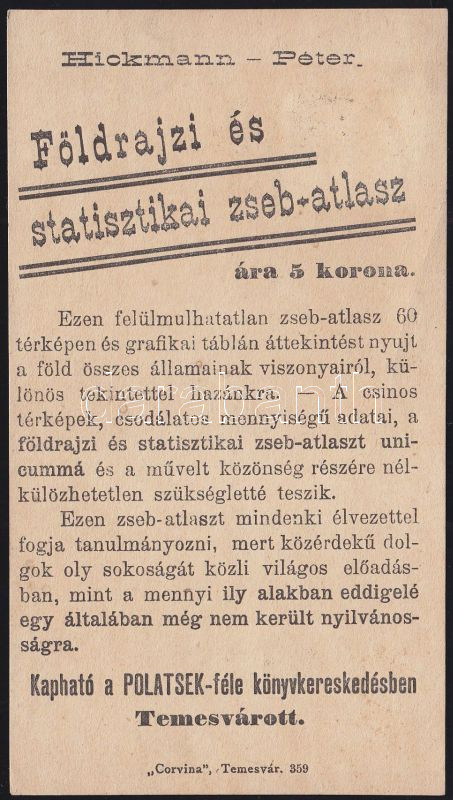 Leírás: 1897 Földrajzi és statisztikai zsebatlasz reklám levelezőlap